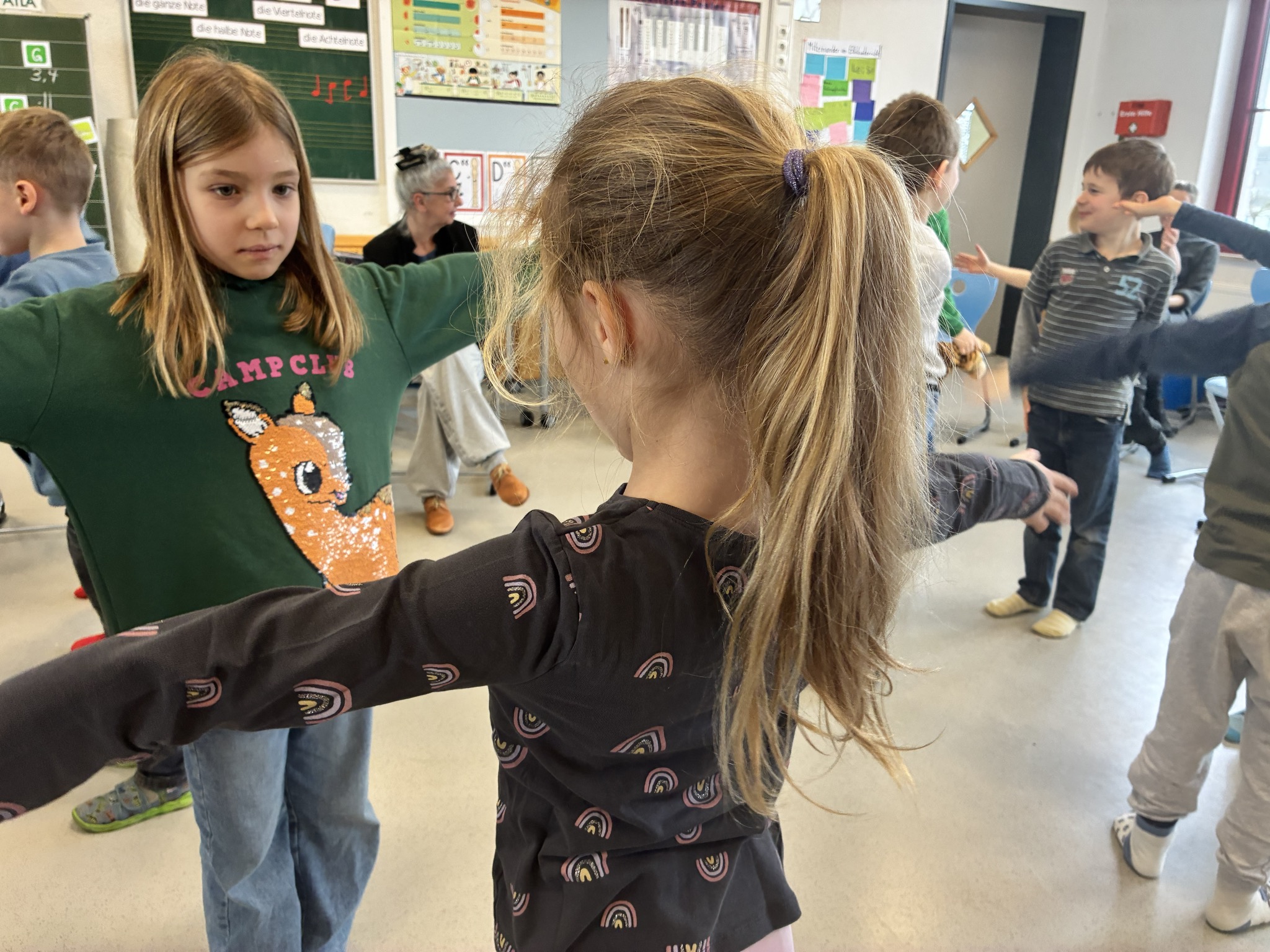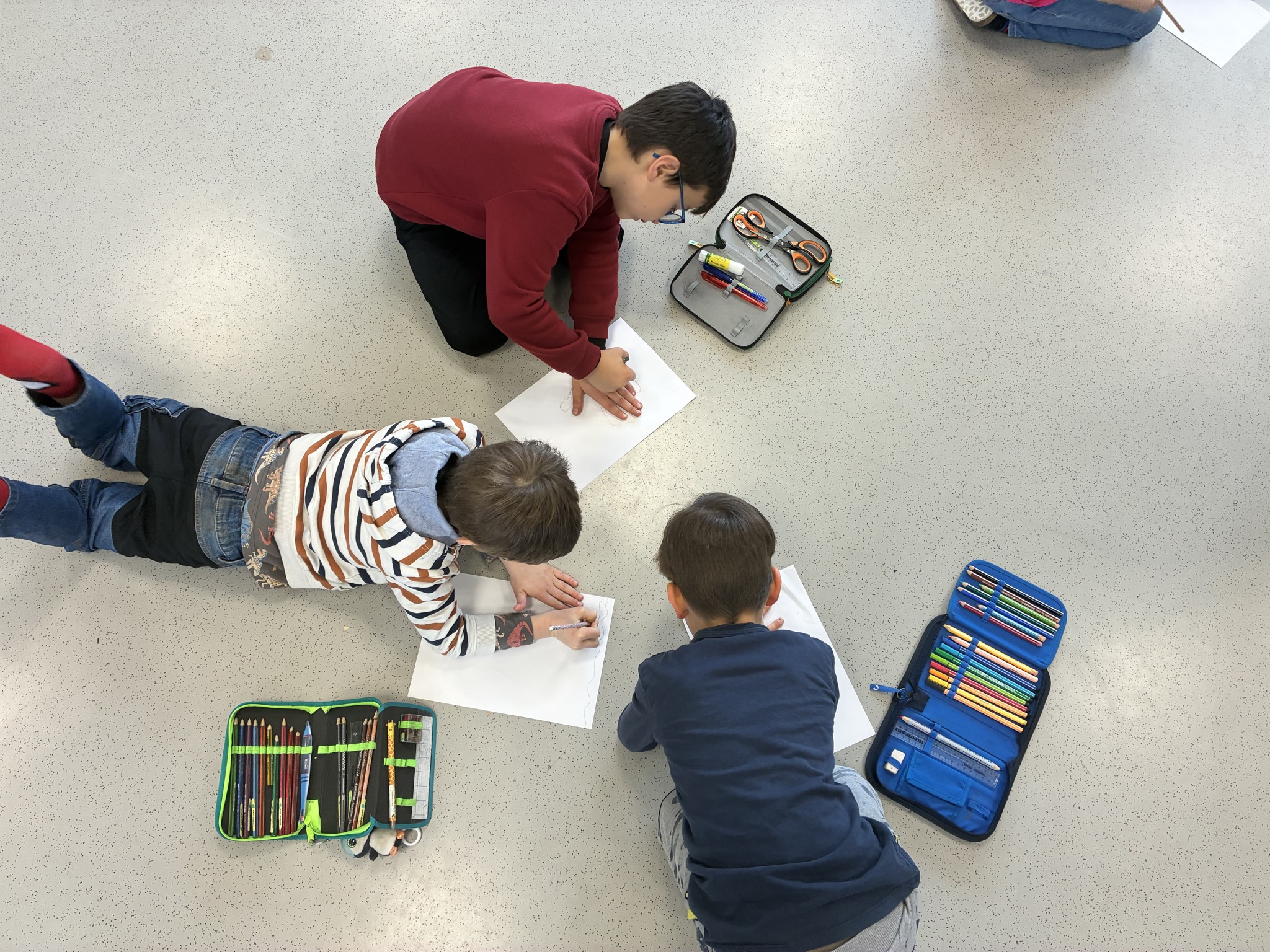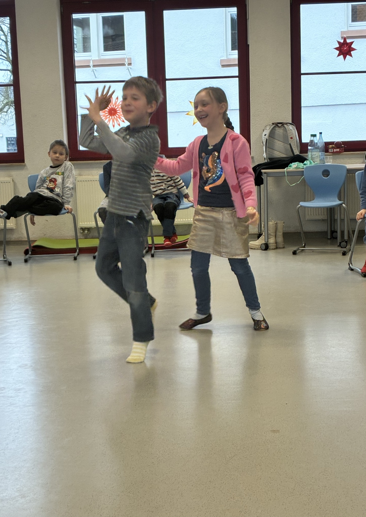 Es wurde viel gelacht, improvisiert und konzentriert gearbeitet. Die Kinder setzten sich mit Grundlagen des Stehgreiftheaters auseinander, probierten neue Rollen aus und entwickelten eigene kleine Szenen, Improvisationen und kurze Choreografien. Mit großer Offenheit bewegten sie sich zur Musik durch den Raum, präsentierten ihre Ergebnisse vor der Gruppe und unterstützten sich gegenseitig mit wertschätzendem Applaus. Besonders eindrucksvoll war die Verbindung von Bewegung und Kunst: Eigene Bewegungsabläufe wurden zunächst malerisch festgehalten und anschließend tänzerisch umgesetzt.